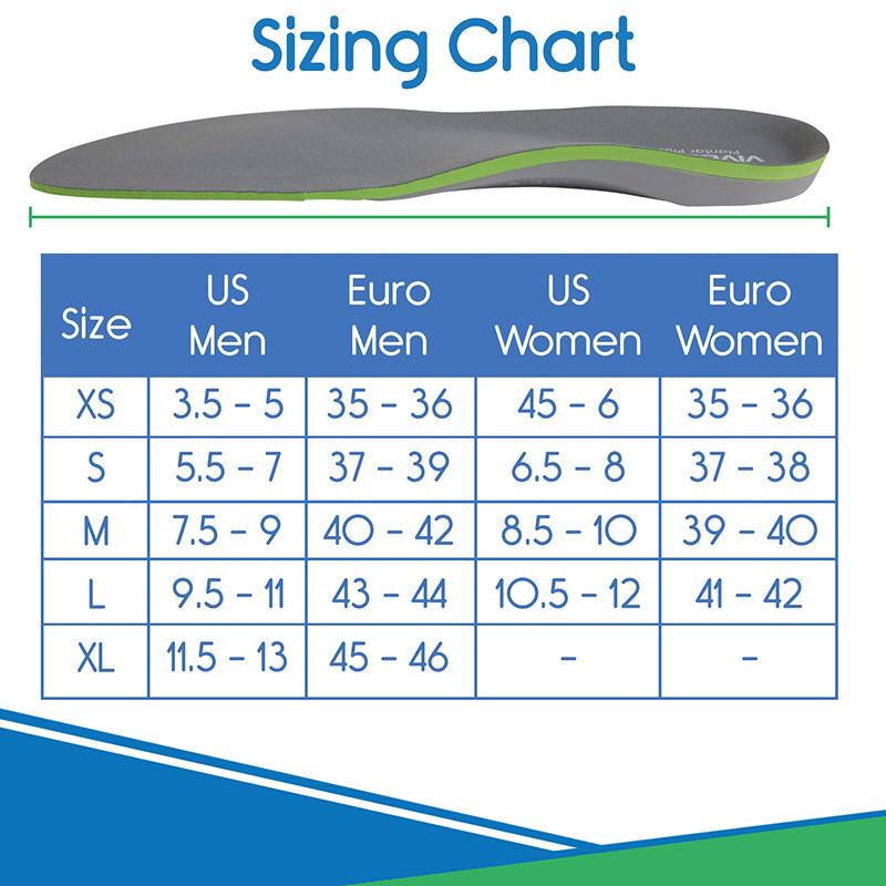 Supporting the natural shape of the foot with a shock absorbing foam and firm composite material, the VIVEsole Plantar Plus full orthotic insoles utilize a proven podiatrist design to relieve foot pain caused by plantar fasciitis, flat feet, high arches, metatarsalgia and other conditions. A reinforced arch and deep heel cup provide maximum support throughout the day for exceptional pain relief. Easily worn in most shoe styles, including casual, dress and athletic shoes, the insoles can be trimmed for a customized fit. The washable insoles are also lined with a soft, antimicrobial material to eliminate odors and bacteria buildup.