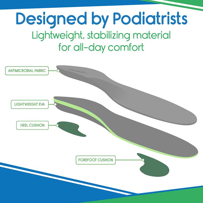 Designed by podiatrists to provide superior foot support, the arch and heel are reinforced with a firm composite material. Effectively stabilizing the foot, the cushioning insoles relieve pain caused by flat feet, and overpronation, as well as heel and metatarsal pain.